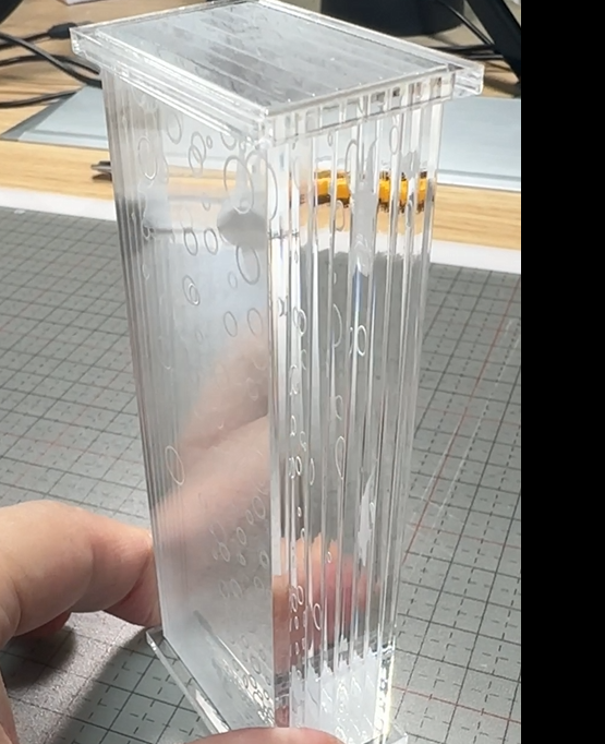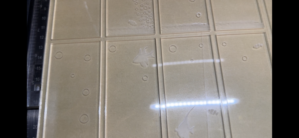 彫刻したすぐのアクリルは表面に彫刻のカスがたくさん付着しています。このままにしておくと汚れや傷の原因になるため傷をつけないように慎重に取り除いてください。(面倒な時は水洗いしちゃいます)