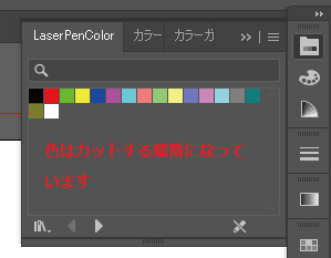 機械を購入すると色指定用のスウォッチがもらえます。黒は彫刻用なので赤から順番に使ってください。0.01mmに指定した線にのみ対応しますのでカットしないときは線の設定を間違えていることが多いです。
