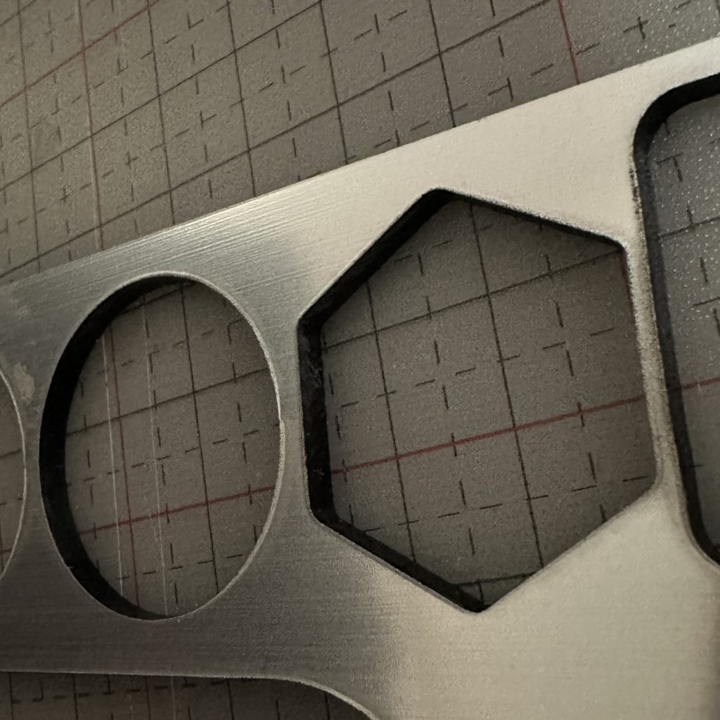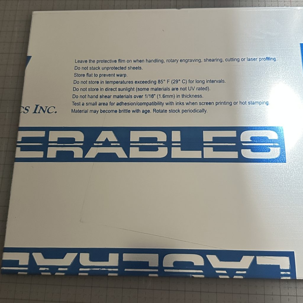 今回は厚みを3mmシルバータイプの2層板を使いました。表面にシルバーの薄い層がつくってあり、シルバーの部分をレーザーで削って2色のデザインを表現することが出来ます。