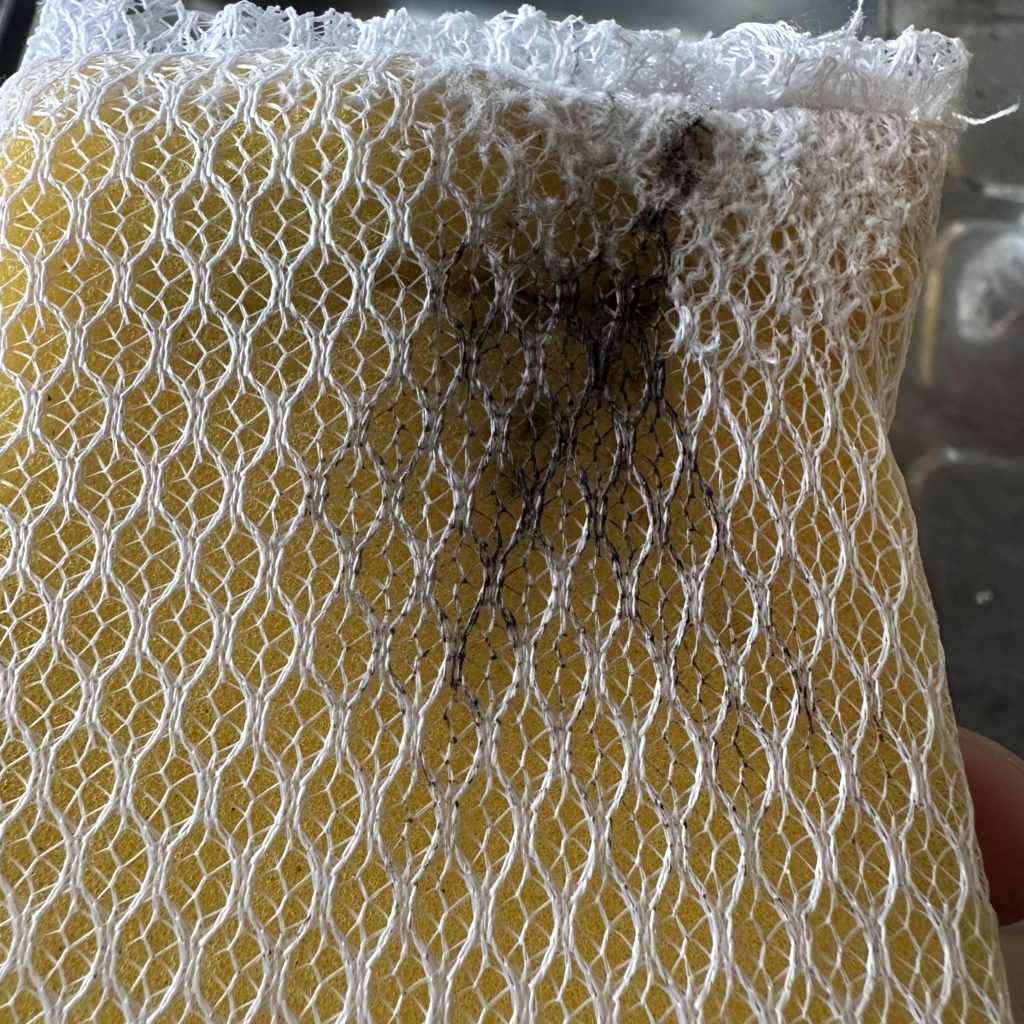 彫刻を始めると表面を削ったカスが出てきます。集塵フィルターをつけていないとカスと匂いで部屋の中がすごいことになります。表面を削るときは上側から空気を吸うように設定し、カットするときは下側から吸うように設定します。(手動でやってます)カットした後はススやヤニなどが付着しているため中性洗剤を少し含んだやわらかい布で傷がつかないようにふき取っています。カットした小口部分は汚れがこびりついているのでスポンジでとっています。1回掃除しただけでこのくらい汚れが付きます。