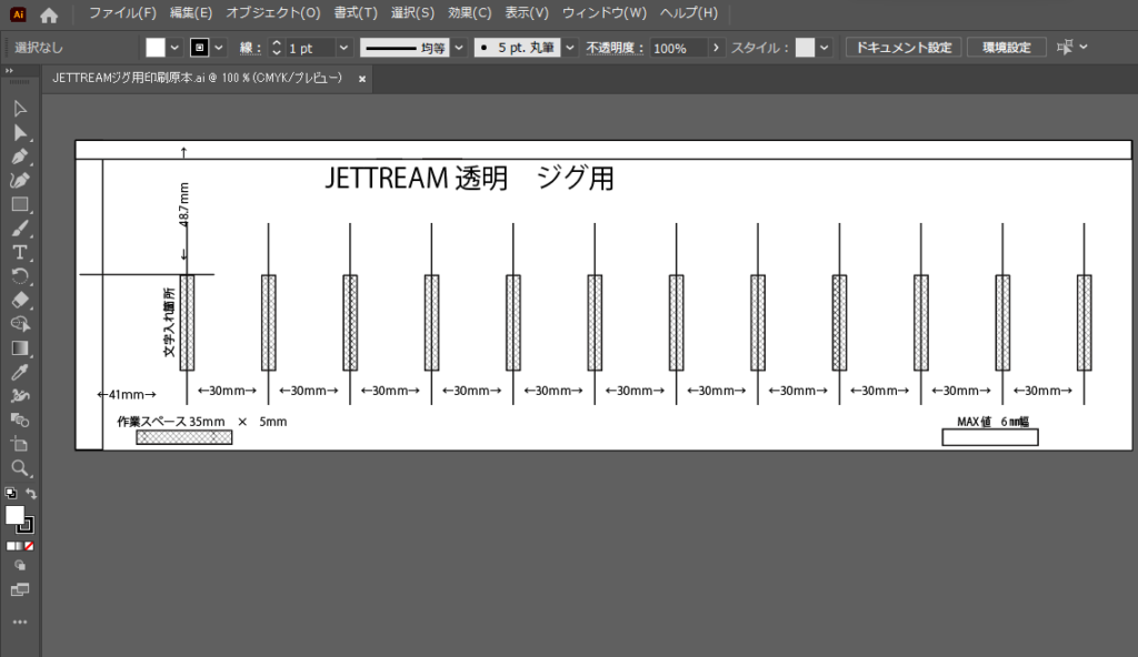 何本印刷するかによってデーターの作り方が変わりますが今回は12本同時に印刷できるような台紙を作りたいと思います。UVプリンタの印刷面は平らな台に置くようになっているので基準の点が正確に出せることと、正しい位置に設置できれば誤差1mm以内に収めることが出来ます。紙に基準になる位置とボールペンの設置位置を印刷してそこにボールペンを置いて印刷するのが一番単純で簡単な方法です。