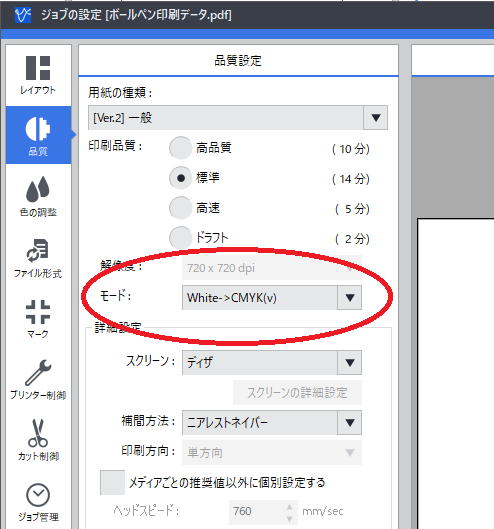 今回は白インクが必要なため 白インクを先に印刷してその後にカラーを印刷する設定にします。品質のモードから「White->CMYK」を選択してください。あとは印刷ボタンを押せば印刷スタートです。