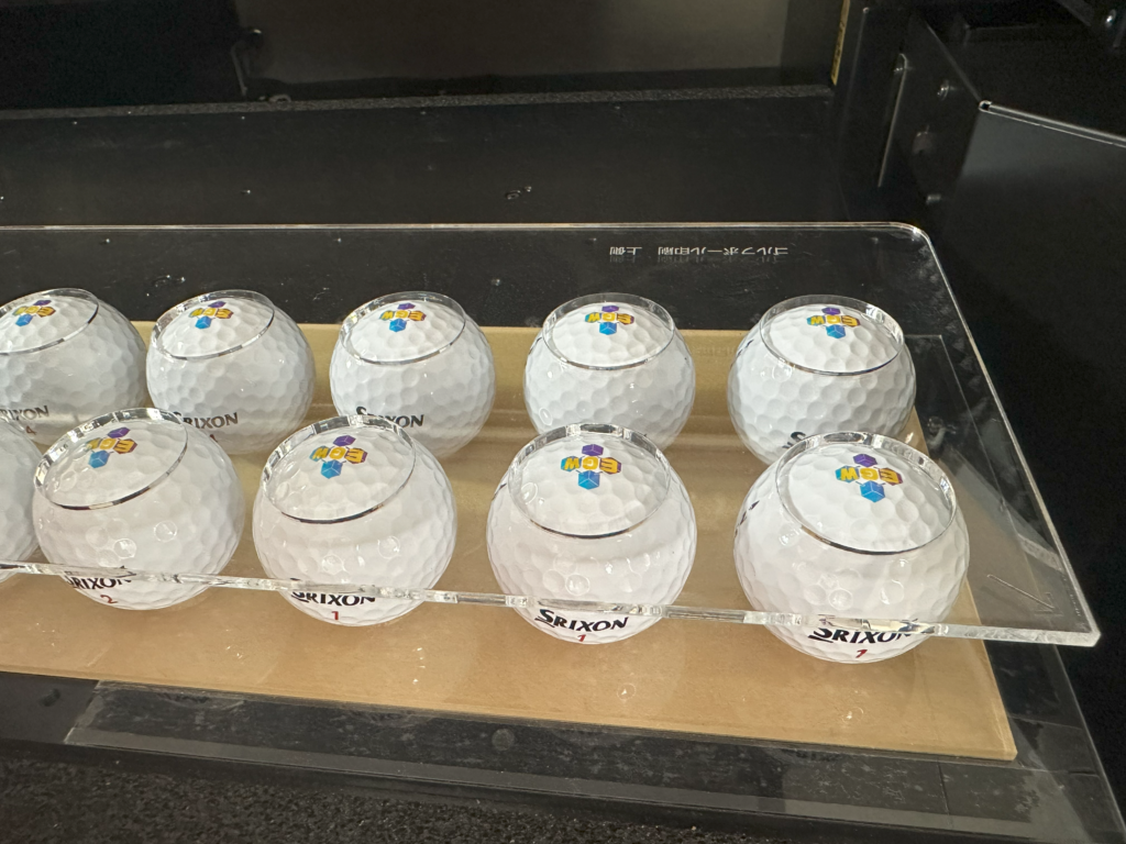 左の写真のように印刷中に動かない工夫をするとゴルフボールなどの球体にも印刷出来ちゃいます。