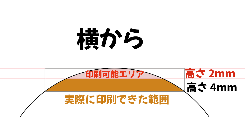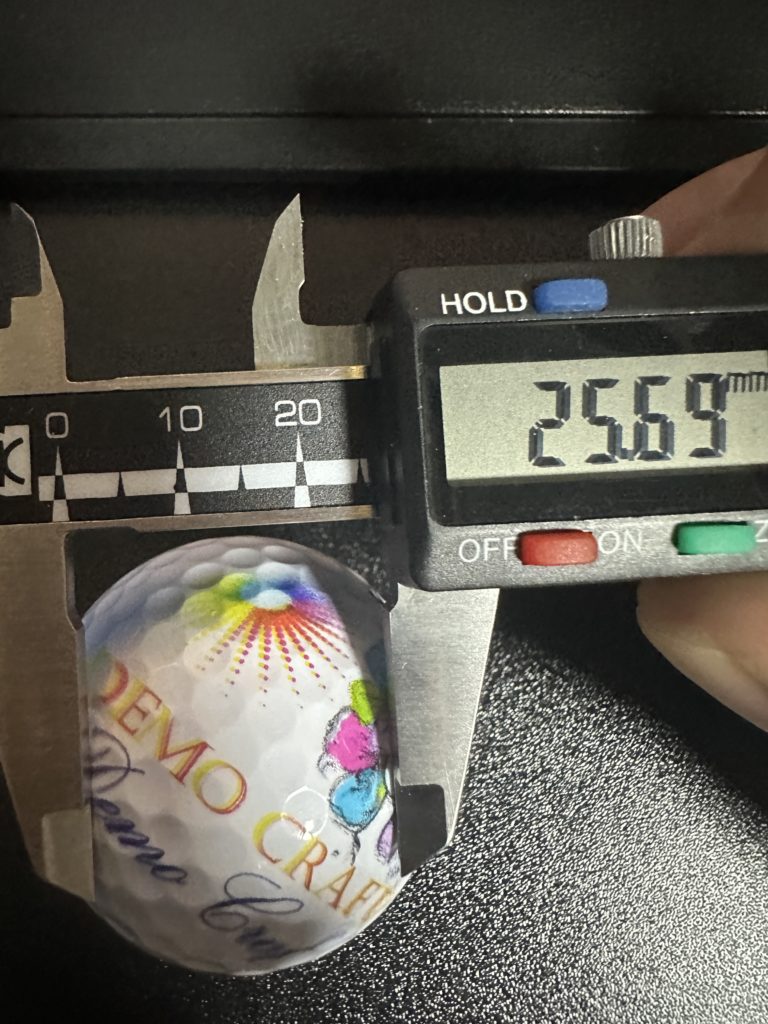 実験でゴルフボールサイズで上から印刷してみました。メーカーからは2mm以上の高低差で印刷した場合「空気中にインクが拡散してヘッドになどに付着してヘッドの目詰まりの原因になる」と注意を受けていましたので、1回だけの挑戦です!(この後ちゃんとヘッドのクリーニングをしておきました)