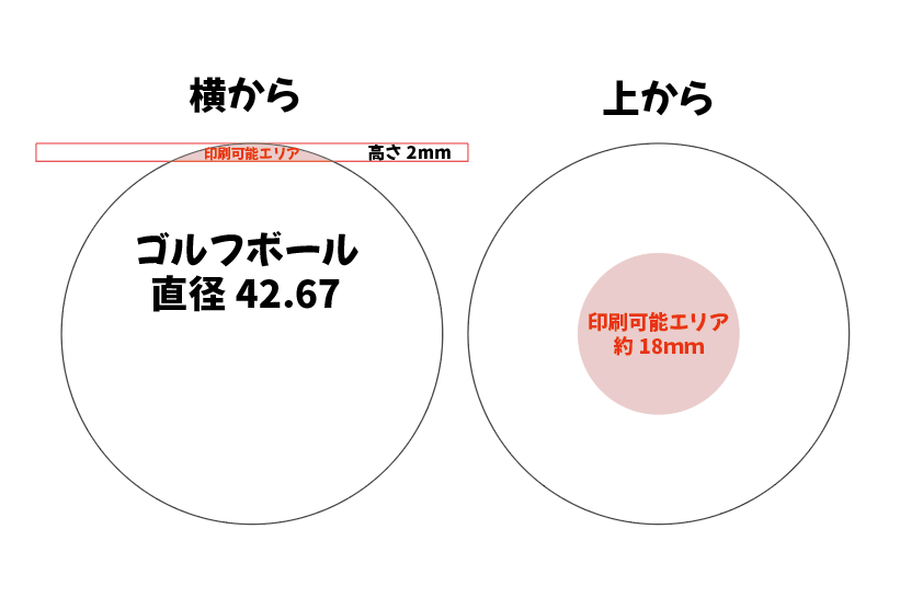 illustratorで42.67mmの円を描いて高さ2mmの四角を重ねてみたいと思います。四角と円の交点を図ってみると約18mmの印刷範囲があることがわかりました。この範囲に収まるデザインを作ればメーカー推奨範囲でゴルフボール印刷が可能ということがわかりました。