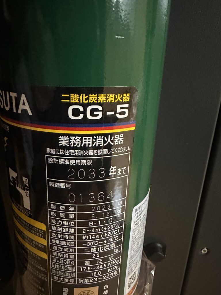 絶対に消火器は用意した方がいいです。消火時に機械を壊したくないので二酸化炭素消火器を用意しています。普通の消火器を使った時点で粉で全部だめになってしまいます。