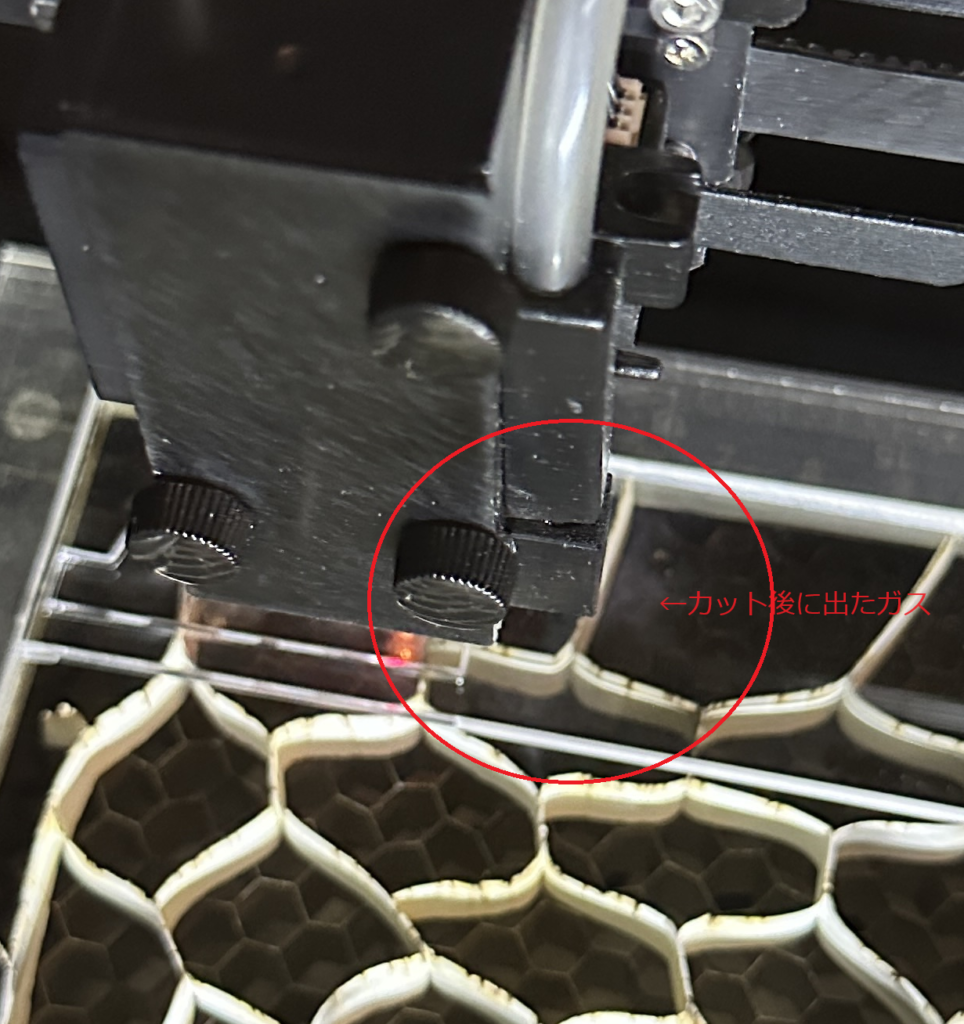 透明アクリルをカットしているとレーザーで焼いた後に出たガスに引火することはよくあります。通常はガスを吸引しているのですぐに消えるので問題ありません。左の写真がカットしたときにガスが出ている状態を撮影しています。うっすらと白いガスが出ています。右の写真がガスに引火した瞬間です。